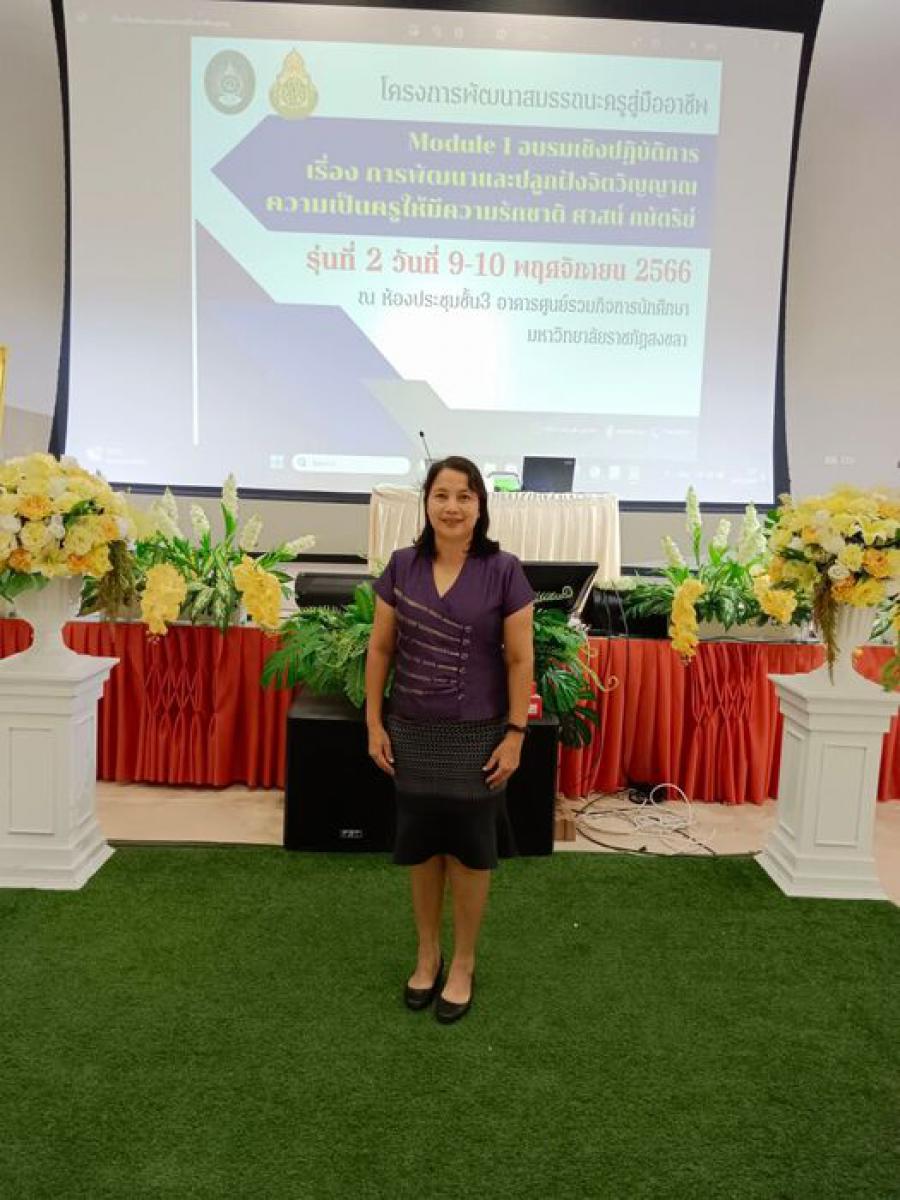 ระหว่างวันที่ 9-10 พฤศจิกายน 2566 คุณครูสุปาณี สุวรรณโณ (รุ่นที่ 2) และระหว่างวันที่ 13-14 พฤศจิกายน 2566 คุณครูสุธีกานต์ จิตรวีระนันรังษี คุณครูชนาพร จันทร์พุ่ม (รุ่นที่ 3) เข้าร่วมกิจกรรมโครงการพัฒนาสมรรถนะครูสู่มืออาชีพ และเพื่อพัฒนาปลูกฝังจิตวิญญาณความเป็นครูให้มีความรักชาติ รักชาติ ศาสน์ กษัตริย์ ตามโครงสร้างหลักสูตร 3 ส่วน ณ มหาวิทยาลัยราชภัฎสงขลา S:0